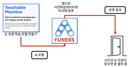 사전에 구글티처블 머신에서 반별 손모양을 학습한 후에 스파트폰의 AI앱 을 활용해 학습데이터와 스마트폰 카메라에 보여준 이미지를 비교해 약속 된 시간과 이미지가 같으면 도어락이 열린다.