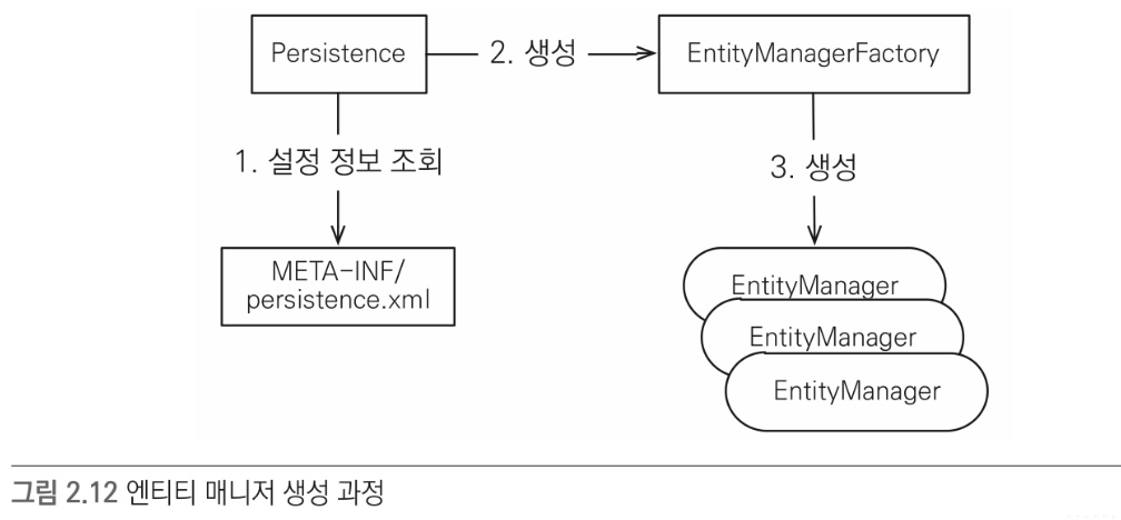 - persistence.xml의 설정 정보를 사용해 엔티티 매니저 팩도리를 생성해야한다. 이 엔티티 매니저 팩토리는 애플리케이션 전체에서 딱 한번만 생성해야한다.