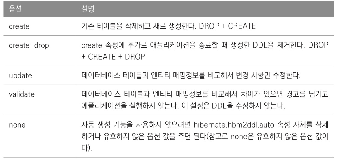 - hibernate.hbm2ddl.auto 속성