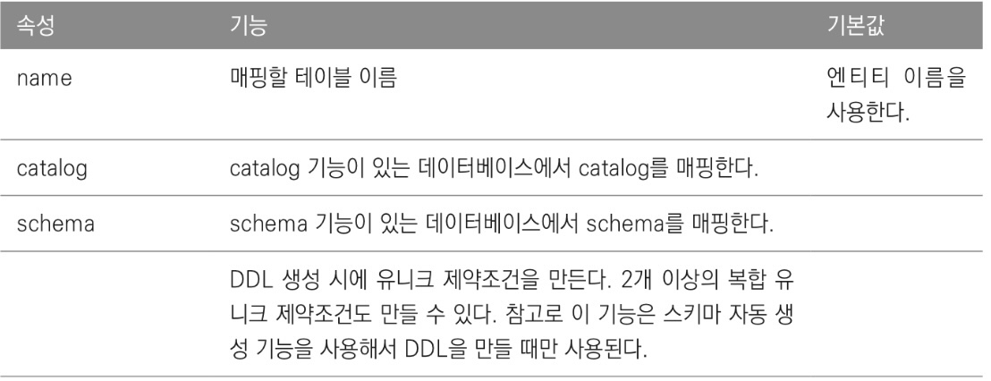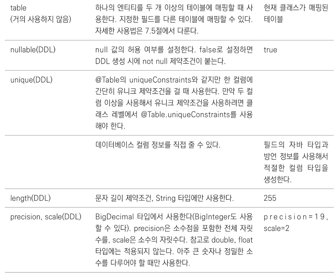 - nullable속성 값을 false로 지정하면 자동 생성되는 DDL에 not null 제약 조건 추가됨