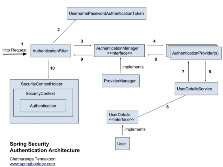 - AuthenticationProvider는 UserDetails에 들어있는 사용자 비밀번호를 토큰의 비밀번호와 비교하고, 일치하면 권한 등의 사용자 정보를 추가하여 객체 반환