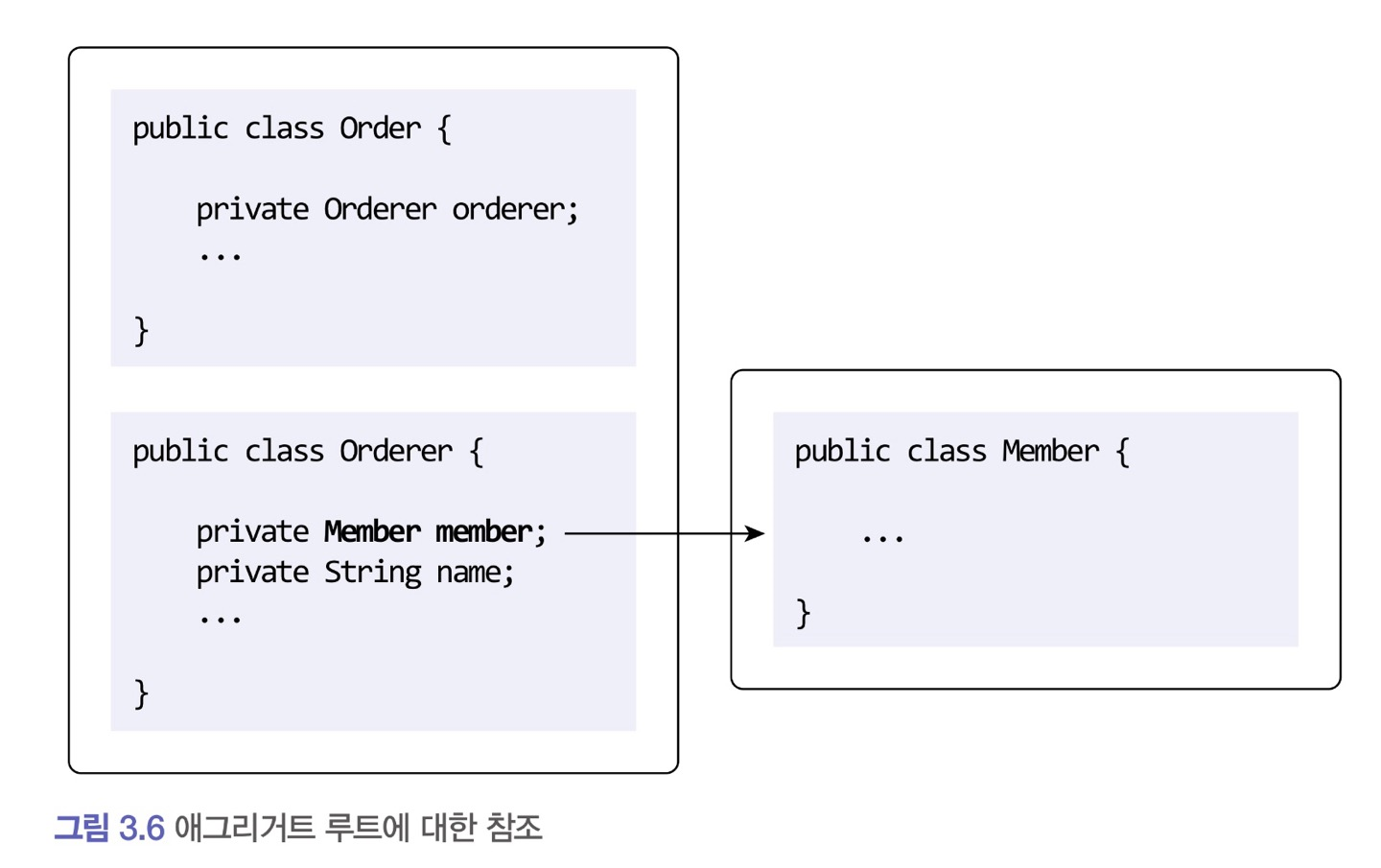 ex) 주문 애그리거트에 속해 있는 Orderer는 주문한 회원을 참조하기 위해 회원 애그리거트 루트인 Member를 필드로 참조 가능